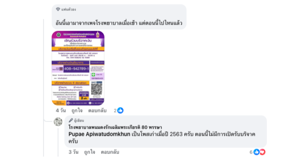 สำหรับข้อมูลที่แชร์กัน เป็นภาพอินโฟกราฟิกเชิญร่วมบริจาคเงินเพื่อพัฒนาโรงพยาบาลและซื้อครุภัณฑ์ทางการแพทย์ที่ขาดแคลน ในช่วงสถานการณ์โควิด-19 เมื่อปี พ.ศ. 2563 ทำให้ประชาชนหลายคนอาจเกิดความสับสนและไม่แน่ใจเกี่ยวกับสถานะการบริจาคปัจจุบัน