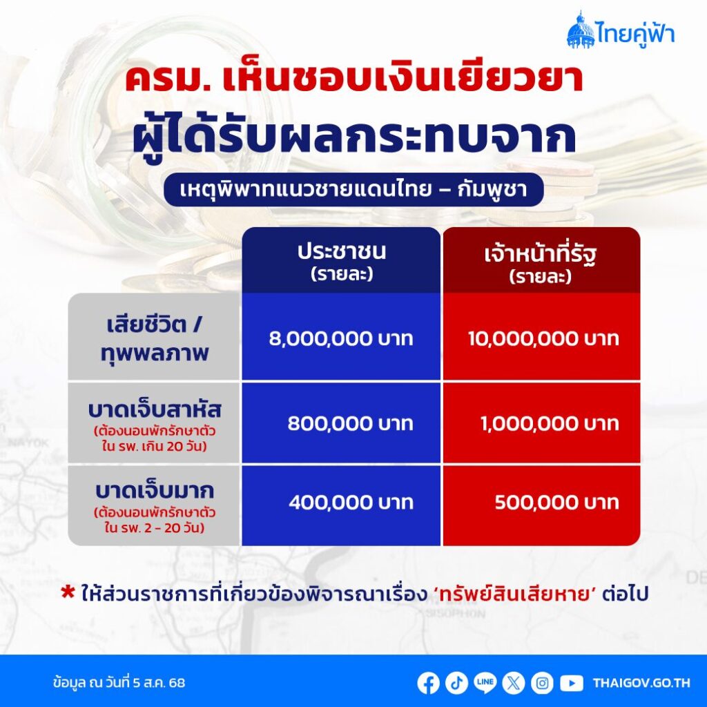 - 🔵 ครม. ได้มีมติอนุมัติเงินเยียวยาให้แก่ครอบครัวทหารที่เสียชีวิต รวมรายละ 10 ล้านบาท และครอบครัวประชาชนที่เสียชีวิต รวมรายละ 8 ล้านบาท