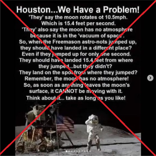 มีข้อมูลเท็จเกี่ยวกับโครงการ Apollo เผยแพร่ทางสื่อสังคมออนไลน์ในต่างประเทศ โดยอ้างว่าภาพการกระโดดของนักบินอวกาศบนพื้นผิวดวงจันทร์ เป็นหลักฐานยืนยันว่าเหตุการณ์ทั้งหมดเกิดขึ้นบนพื้นโลก เนื่องจากบนดวงจันทร์ไม่มีชั้นบรรยากาศ เมื่อคนกระโดดบนดวงจันทร์จะไม่ได้รับอิทธิพลจากแรงโน้มถ่วงของดวงจันทร์ และจะตกลงมายังตำแหน่งที่ต่างออกไปจากจุดที่กระโดด ตามความเร็วการหมุนรอบตัวเองของดวงจันทร์ที่ 16.8 กิโลเมตรต่อชั่วโมง หรือ 15.4 ฟุตต่อวินาที