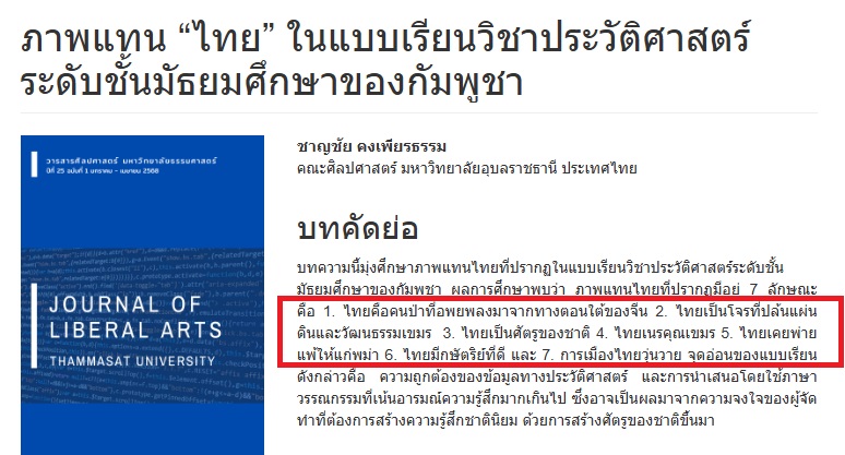 In late July 2025, a study by Chanchai Khongphiantham from the Faculty of Liberal Arts at Ubon Ratchathani University was shared online in Thailand. The research, titled “Representations of ‘Thailand’ in Cambodian Secondary School History Textbooks”, confirmed that Cambodian education materials contain content that fosters hatred toward Thais. The information was often biased and deviated significantly from historical accuracy.
