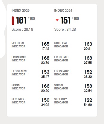ดัชนีเสรีภาพสื่อของ Reporters Without Borders ปี 2025 พบว่า กัมพูชาติดอันดับที่ 161 จากทั้งหมด 180 ประเทศ โดยปีนี้มีนักข่าวถูกจำคุกในกัมพูชาไปแล้ว 4 ราย