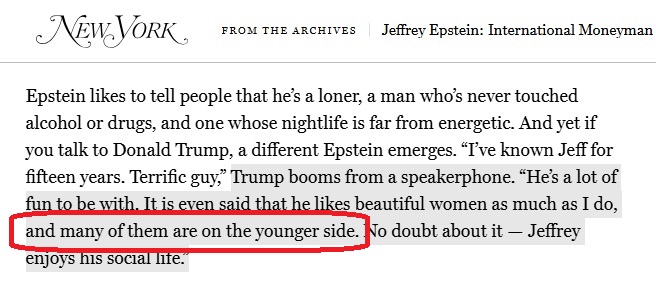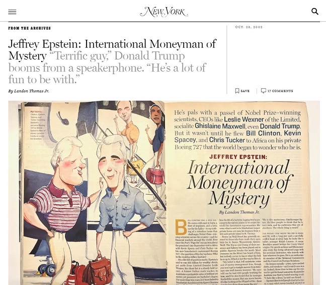 นิตยสาร New York เคยเผยแพร่บทสัมภาษณ์ของ โดนัลด์ ทรัมป์ ในปี 2002 โดยว่าที่ผู้นำสหรัฐฯ 2 สมัยกล่าวถึง เจฟฟรีย์ เอปสตีน ว่า “ผมรู้จักเจฟมา 15 ปี เป็นคนที่ยอดเยี่ยม เขาเป็นคนสนุกสนาน และชอบสาวสวยเหมือนกับผม สาว ๆ หลายคนก็อายุน้อยมาก ๆ ไม่ต้องสงสัยเลยว่าเจฟฟรีย์ชื่นชอบไลฟ์สไตล์ของเขาแค่ไหน”