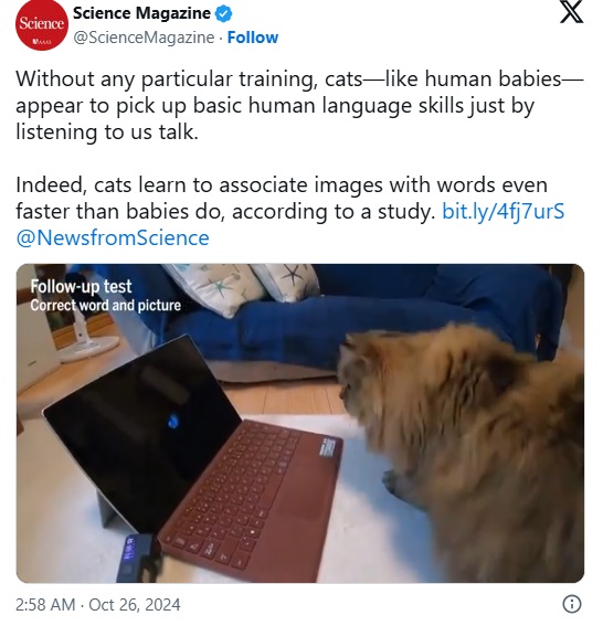 ขณะที่ทารกวัย 14 เดือน ต้องทำแบบทดสอบ 16-20 รอบถึงจะเชื่อมโยงรูปภาพกับคำได้ แต่แมวโตเต็มวัยสามารถเชื่อมโยงรูปภาพกับคำหลังผ่านการทดสอบเพียง 4 รอบเท่านั้น