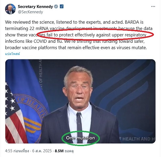 4.เทคโนโลยีวัคซีนแบบเดิมรับมือไวรัสกลายพันธุ์ได้ดีกว่า โดยย้ำว่าจะไม่สนับสนุนโครงการพัฒนาวัคซีนที่ใช้เทคโนโลยี mRNA อีกต่อไป