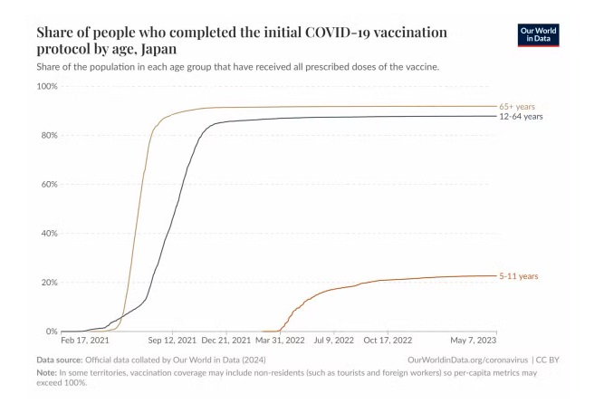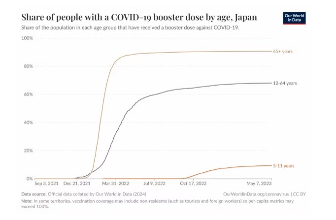 ตามข้อมูลของ Our World in Data พบว่า ขณะที่ญี่ปุ่นมีสัดส่วนประชากรวัยผู้ใหญ่ฉีดวัคซีนโควิด-19 แบบครบโดสสูงมากกว่า 80% แต่อัตราการฉีดวัคซีนเข็มกระตุ้นของคนวัย 12-64 ปีมีไม่ถึง 70% ต่างจากประชากรสูงวัยที่ฉีดวัคซีนเข็มกระตุ้นมากกว่า 90%