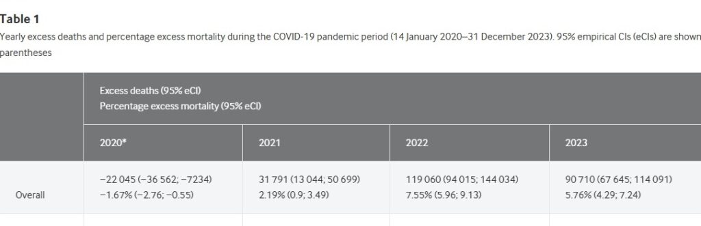 แต่อัตราการเสียชีวิตส่วนเกินกลับค่อย ๆ เพิ่มขึ้น โดยปี 2021 มียอดการตายเพิ่มขึ้น 31,791 ครั้ง ปี 2022 ยอดตายเพิ่มขึ้น 119,060 ครั้ง และปี 2023 เพิ่มขึ้น 90,710 ครั้ง