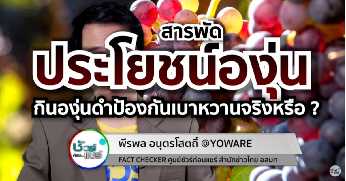 องุ่น ผลไม้รสหวานฉ่ำที่หลายคนชื่นชอบ ไม่เพียงแต่อร่อย แต่ยังมักถูกกล่าวขานถึงสรรพคุณทางสุขภาพนานัปการ ตั้งแต่การเป็น “ยาอายุวัฒนะ” ไปจนถึงการช่วยลดน้ำหนัก แต่ความเชื่อเหล่านั้นเป็นความจริงมากน้อยเพียงใด? รายการ “ชัวร์ก่อนแชร์” ได้ทำการตรวจสอบ 5 เรื่องที่แชร์มาเกี่ยวกับองุ่น เพื่อให้ผู้บริโภคได้ข้อมูลที่ถูกต้องและชัดเจนที่สุด