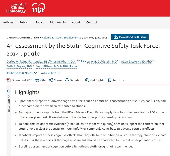 ข้อมูลปี 2014 ของสมาคม National Lipid Association ในสหรัฐฯ สรุปว่า แม้จะพบปัญหาด้านความทรงจำในกลุ่มผู้ใช้ยา Statins บางราย แต่หลักฐานทางวิทยาศาสตร์ที่เชื่อมโยงปัญหาทางสมองกับยา Statins ขาดหลักฐานที่ชัดเจนหรือไม่พบความสัมพันธ์ใด ๆ
