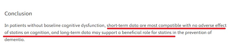 งานวิจัยปี 2002 ในสหราชอาณาจักรกับกลุ่มตัวอย่างอายุ 40-82 ปี จำนวน 25,000 ราย แบ่งเป็นกลุ่มที่ใช้ยา Statins เป็นเวลา 3 ปี 5 ปี และกลุ่มที่ไม่ใช้ยา พบว่าการทำงานของสมองของทั้ง 3 กลุ่มไม่มีความแตกต่างกัน
