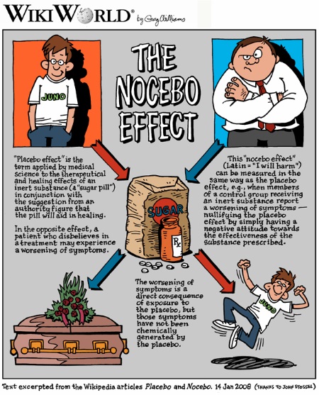 ข้อมูลจากเว็บไซต์สถาบันการแพทย์ Mayo Clinic รายงานถึงการพบปรากฏการณ์ Nocebo Effect ในกลุ่มผู้รับยา Statins ซึ่งการแบ่งกลุ่มตัวอย่างเป็นกลุ่มผู้ได้รับยา Statins และกลุ่มที่ได้รับยาหลอก ปรากฏว่ากลุ่มผู้ได้รับยา Statins รายงานอาการปวดกล้ามเนื้อน้อยกว่ากลุ่มที่ได้รับยาหลอก 5%