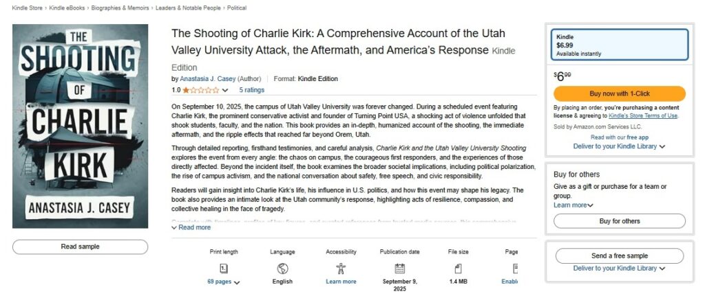 หนังสือดังกล่าวมีชื่อว่า The Shooting Of Charlie Kirk โดยนักเขียน อนาสตาเซีย เจ. เคสซี จำหน่ายจากเว็บไซต์ Amazon ในราคา 6.99 ดอลลาร์สหรัฐฯ ก่อนจะถูกลบจากระบบในเวลาต่อมาในข้อหาละเมิดระเบียบของทางเว็บไซต์