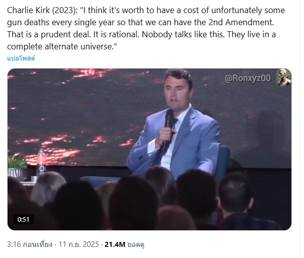 มีข้อความน่าสงสัยเกี่ยวกับ ชาร์ลี เคิร์ก นักเคลื่อนไหวทางการเมืองที่ถูกลอบสังหารเผยแพร่ทางสื่อสังคมออนไลน์ โดยอ้างว่า ชาร์ลี เคิร์ก มองว่าการมีคนตายจากอาวุธปืนทุก ๆ ปี เป็นความสูญเสียที่คุ้มค่า เพื่อแลกกับการดำรงอยู่ของกฎหมายปกป้องสิทธิการครอบครองปืน ซึ่งเป็นกฎหมายรัฐธรรมนูญของสหรัฐฯ
