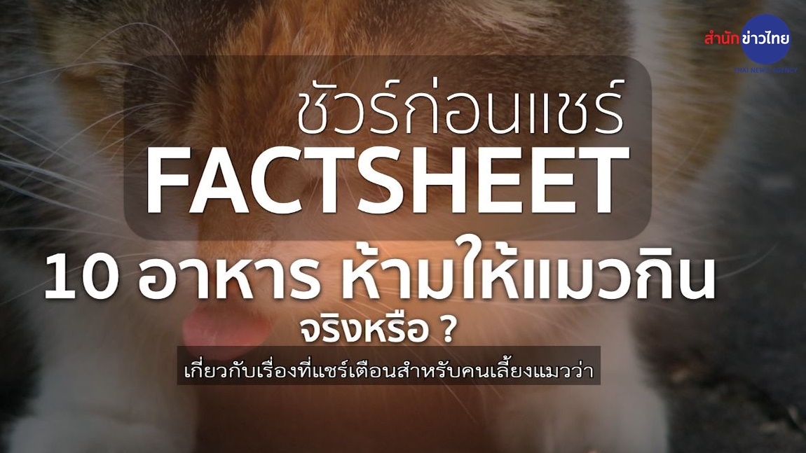 กรุงเทพฯ 30 ก.ค.- บนสังคมออนไลน์แชร์เตือนคนที่เลี้ยงแมวว่า มีอาหาร 10 ชนิดที่ห้ามให้แมวกิน ตั้งแต่ยาพาราเซตามอล ช็อกโกแลต ผักผลไม้บางชนิด ไปจนถึงปลาดิบ และตับ เรื่องนี้เป็นอย่างไร ? ติดตามจากศูนย์ชัวร์ก่อนแชร์.-สำนักข่าวไทย