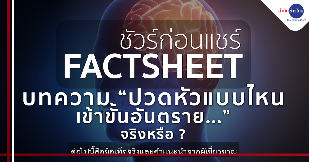 กรุงเทพฯ 18 ก.ย.-บนสังคมออนไลน์ แชร์บทความเรื่อง “ปวดหัว อาการแบบไหน เข้าขั้นอันตราย” ซึ่งอธิบายอาการปวดหัวไว้หลากหลายแบบ แต่ข้อเท็จจริงเรื่องนี้เป็นอย่างไร ติดตามจากศูนย์ชัวร์ก่อนแชร์.-สำนักข่าวไทย