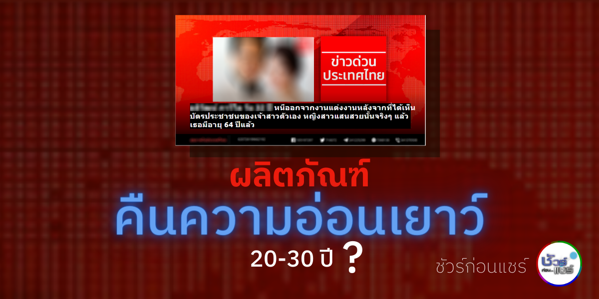 บนสังคมออนไลน์ แชร์เว็บไซต์โฆษณาผลิตภัณฑ์เสริมความงามชนิดหนึ่ง ซึ่งมีภาพและข้อความ อ้างว่าเจ้าสาวอายุ 64 ปี แต่งงานกับชายหนุ่มอายุเพียง 32 ปี หลังเจ้าสาวใช้ผลิตภัณฑ์เสริมความงาม ช่วยคืนความอ่อนเยาว์ให้ร่างกายและใบหน้าได้ 20-30 ปี เว็บไซต์ดังกล่าวถูกแชร์อย่างแพร่หลายบนโลกออนไลน์ ทำให้มีผู้ส่งเรื่องเข้ามาสอบถามข้อเท็จจริงกับศูนย์ชัวร์ก่อนแชร์