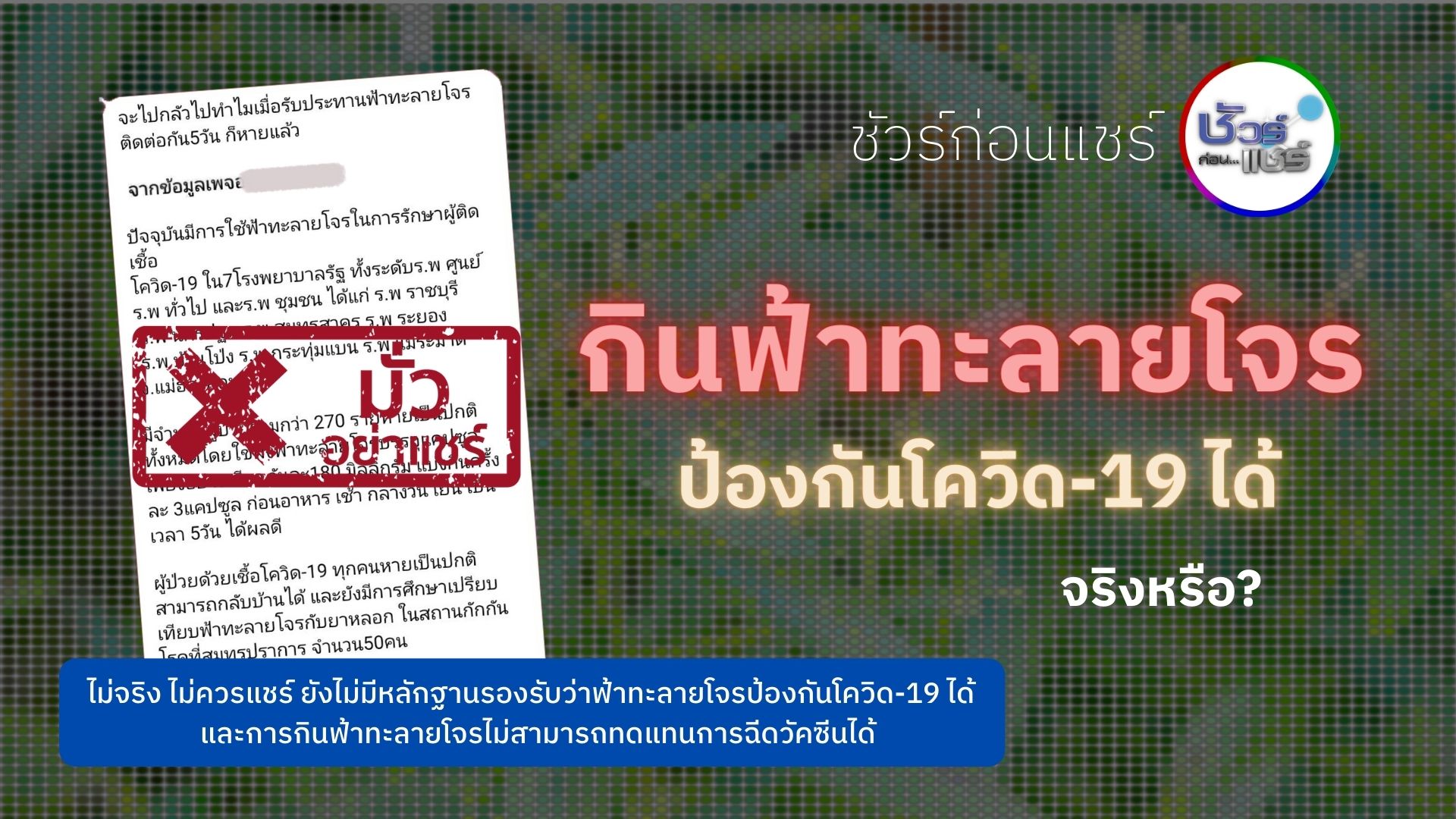 ตามที่มีการแชร์ผ่านสื่อโซเซียลมีเดียว่า กินฟ้าทะลายโจรสามารถป้องกันโควิด-19 ได้ รวมถึงเป็นทางเลือกที่ผู้ป่วยไม่จำเป็นต้องไปฉีดวัคซีนนั้น ศูนย์ชัวร์ก่อนแชร์ตรวจสอบข้อมูลกับ ภญ.ดร.ผกากรอง ขวัญข้าว หัวหน้าศูนย์หลักฐานเชิงประจักษ์ โรงพยาบาลเจ้าพระยาอภัยภูเบศร และ ผศ.นพ.พิสนธิ์ จงตระกูล ประธานคณะทำงานสร้างความเข้มแข็งของประชาชนด้านการใช้ยาอย่างสมเหตุสมผล (สยส.) ระบุตรงกันว่า ไม่เป็นความจริง