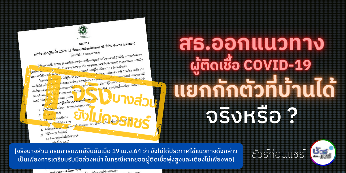 ศูนย์ชัวร์ก่อนแชร์ สำนักข่าวไทย อสมท ตรวจสอบจาก การแถลงข่าวสถานการณ์โรคไวรัสโคโรนา 2019 กระทรวงสาธารณสุข ประจำวันที่ 19 เมษายน 2564 พบว่า แนวทางการพิจารณาผู้ติดเชื้อ COVID-19 ที่เหมาะสมสำหรับการแยกกักตัวที่บ้าน (Home Isolation) ไม่ใช่แนวทางที่ใช้ในปัจจุบันแต่อย่างใด