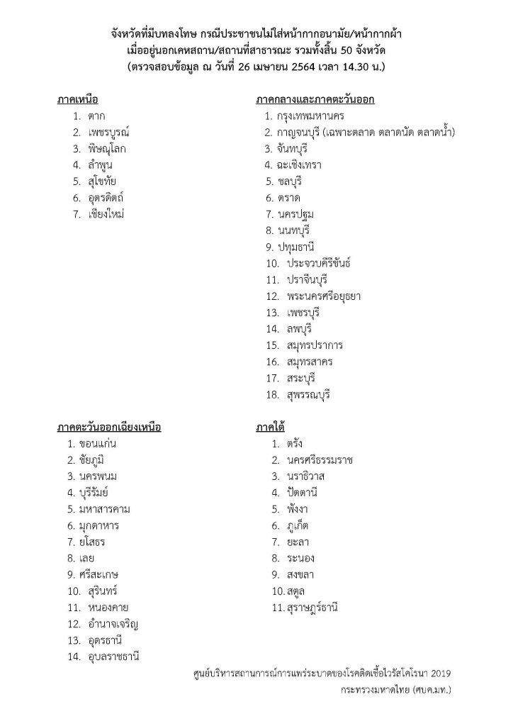เมื่อวันที่ 26 เมษายน 2564 ณ เวลา 14.30 น. ศูนย์โควิดกระทรวงมหาดไทย(ศบค.มท.) ได้อัพเดทรายชื่อ 50 จังหวัดที่มีบทลงโทษ กรณีประชาชนไม่ใส่หน้ากาก ทั้งหน้ากากอนามัย หน้ากากผ้า เมื่ออยู่นอกเคหสถาน หรือ สถานที่สาธารณะ หรือในชุมชน ซึ่งมีโทษปรับไม่เกิน 20,000 (สองหมื่นบาท) ดังนี้