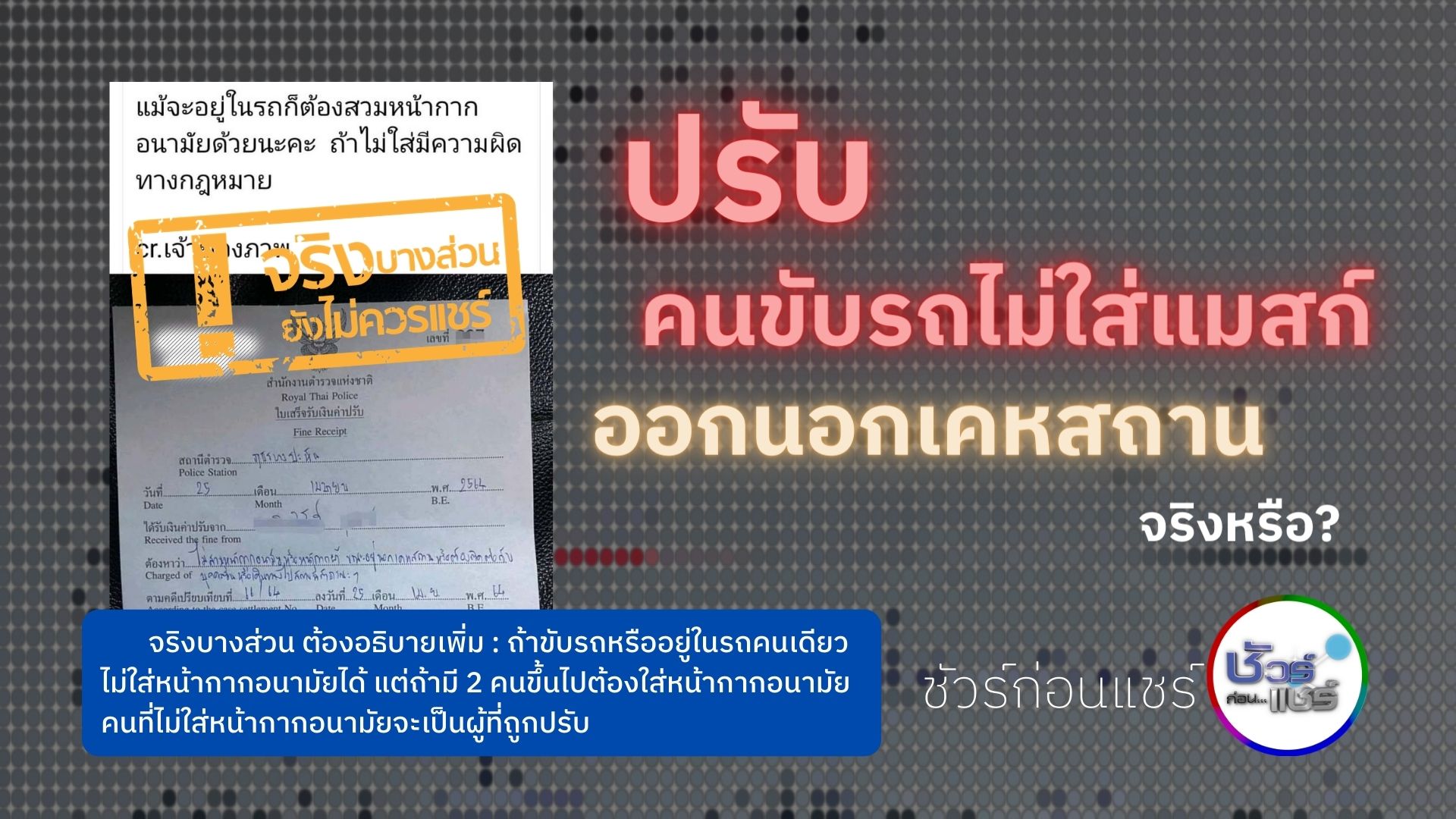 ตามที่มีการแชร์ภาพใบเสร็จรับเงินค่าปรับผ่านสื่อโซเซียลมีเดีย พร้อมคำเตือนว่า หากไม่สวมใส่หน้ากากอนามัยขณะขับรถ ต้องระวางโทษถูกปรับเงินด้วยนั้น จริงบางส่วน ต้องอธิบายเพิ่ม