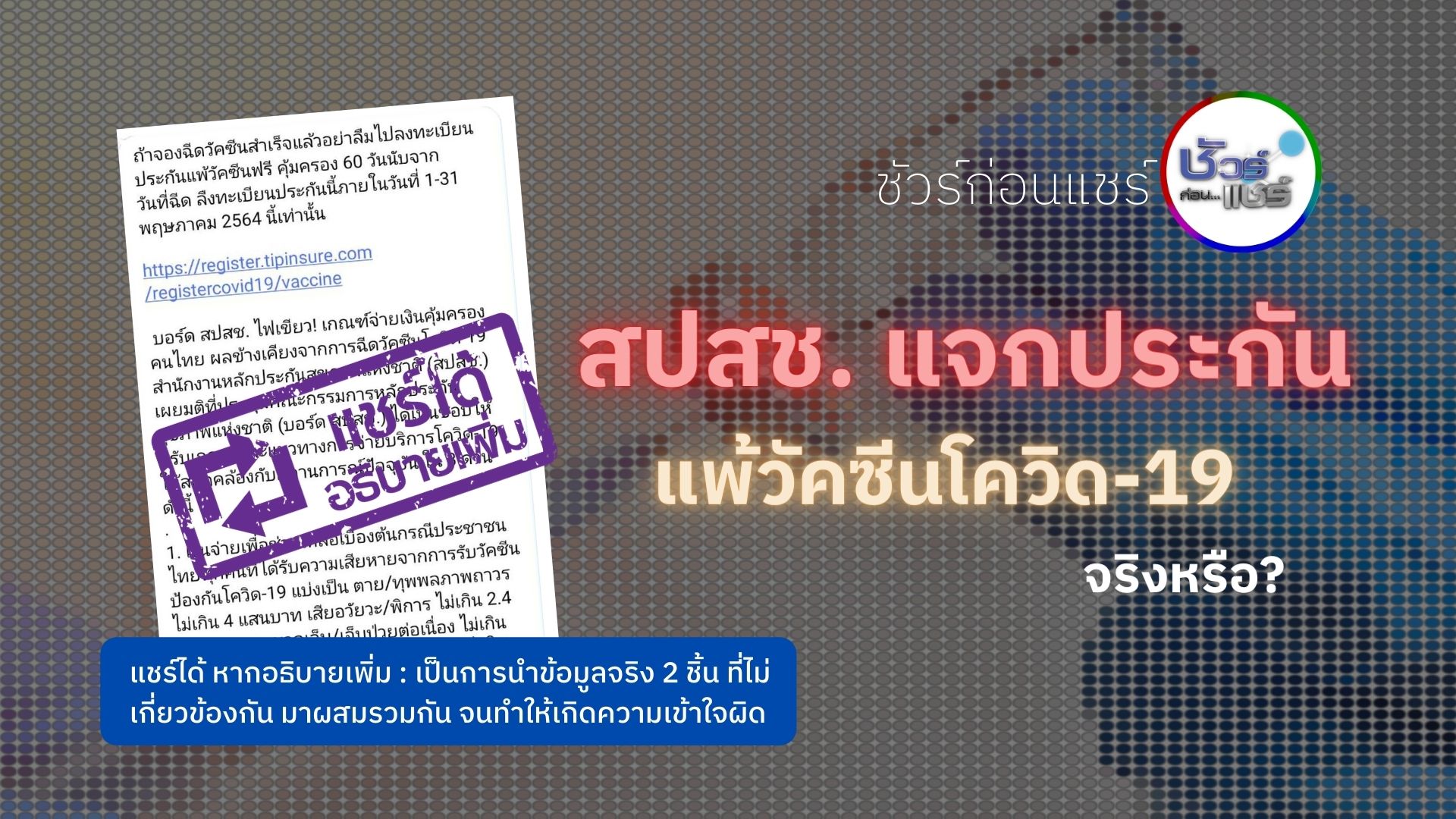ทำความเข้าใจ กรณีข้อความที่แชร์กัน ว่า “ถ้าจองวัคซีนสำเร็จแล้ว อย่าลืมไปลงทะเบียนประกันแพ้วัคซีนโควิด-19”