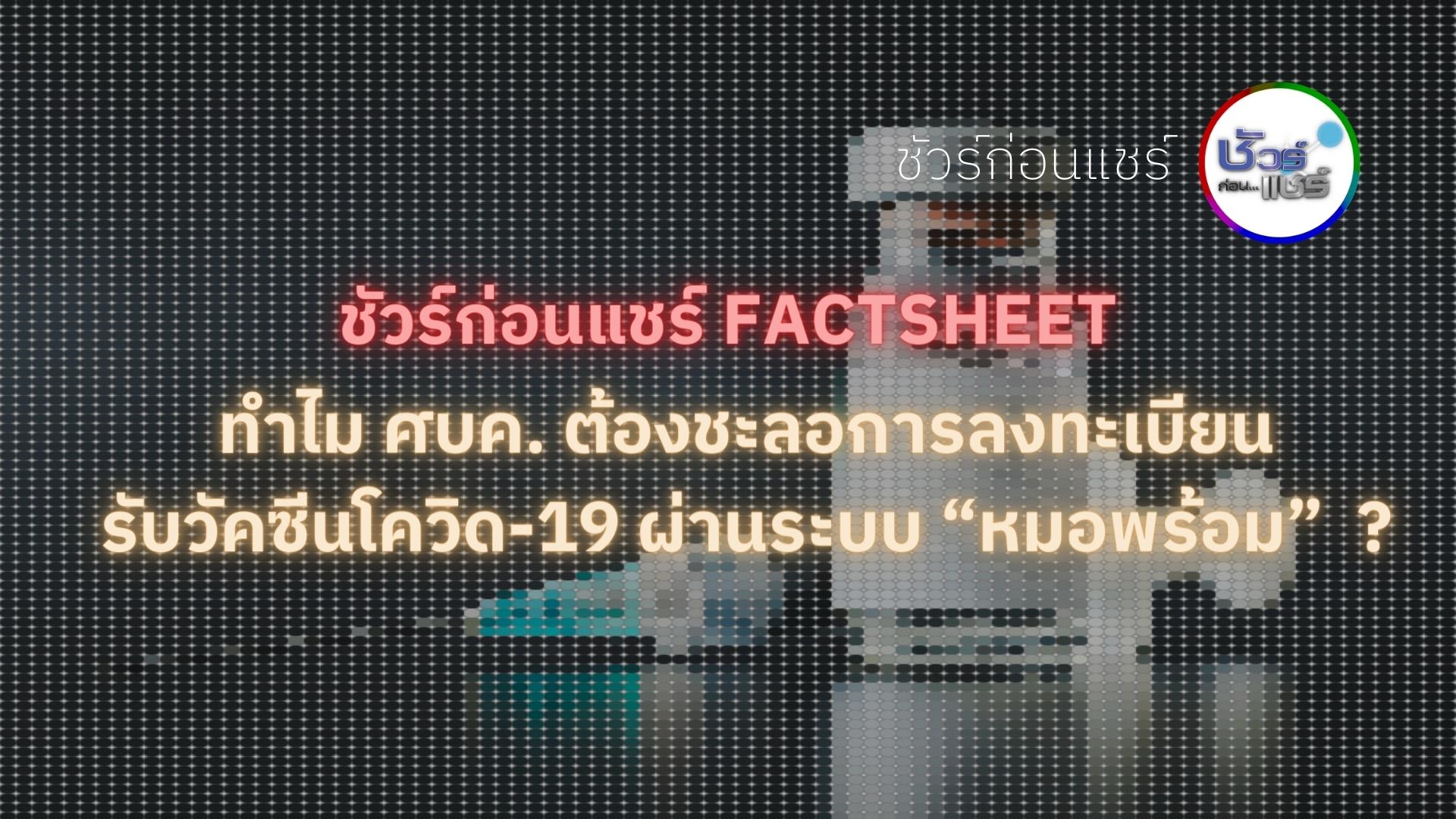 ศูนย์บริหารสถานการณ์การแพร่ระบาดของโรคติดเชื้อไวรัสโคโรนา 2019 (โควิด-19) หรือ ศบค. โดย นพ. ทวีศิลป์ วิษณุโยธิน โฆษกศบค. แถลงว่า ที่ประชุม ศบค. มีมติขอให้การลงทะเบียนเพื่อรับวัคซีนโควิด-19 ผ่านระบบ “หมอพร้อม” ชะลอออกไปก่อน ทำไมจึงต้องชะลอการลงทะเบียนเพื่อรับวัคซีนโควิด-19 ผ่านระบบ “หมอพร้อม” ? หากประชาชนต้องการรับวัคซีนโควิด-19 จะต้องลงทะเบียนผ่านช่องทางใด ? บทบาทของระบบ “หมอพร้อม” หลังจากนี้จะเป็นเช่นไร? ร่วมหาคำตอบไปพร้อมกันกับ “ชัวร์ก่อนแชร์”