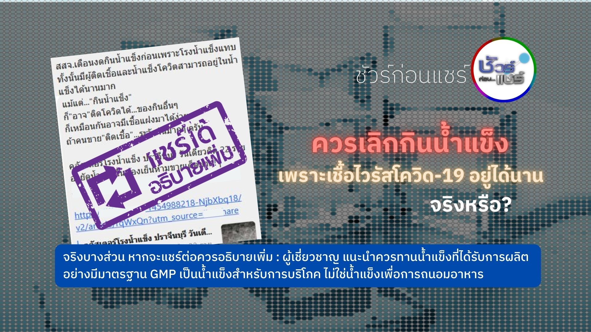 บนสื่อสังคมออนไลน์มีการแชร์ข้อมูลว่า ไม่ควรบริโภคน้ำแข็งในขณะนี้เพราะหลายโรงงานมีพนักงานติดเชื้อโควิด-19 อีกทั้งเชื้อโควิด-19 สามารถอยู่บนพื้นผิวน้ำแข็งได้นาน ศูนย์ชัวร์ก่อนแชร์ ตรวจสอบข้อมูลดังกล่าว พบว่า จริงบางส่วน หากจะแชร์ต้องอธิบายเพิ่ม