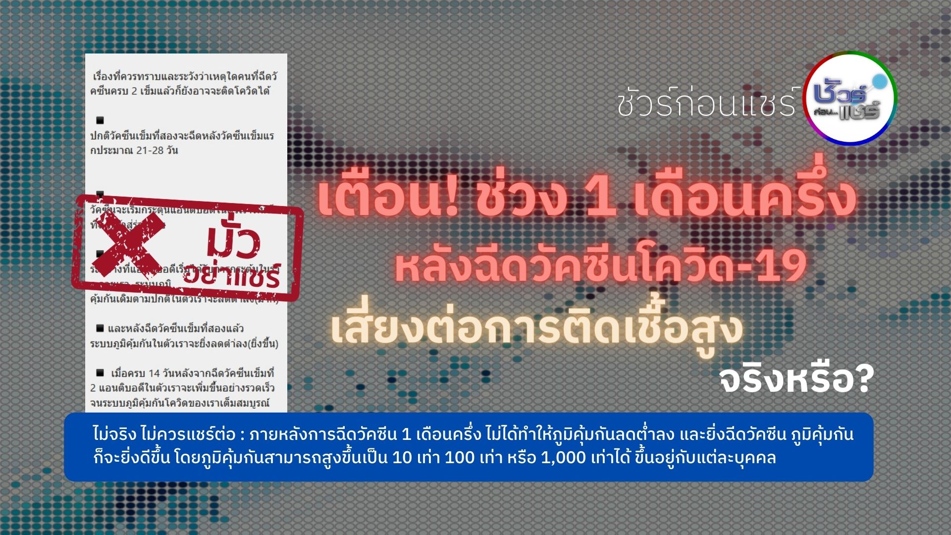 ตามที่มีการแชร์ข้อมูลผ่านสื่อโซเชียลมีเดีย ภายหลังการฉีดวัคซีนโควิด-19 ในช่วง 1 เดือนครึ่ง ระบบภูมิคุ้มกันจะลดต่ำลงมาก หากออกนอกบ้านในช่วงหนึ่งเดือนครึ่งนี้จึงมีความเสี่ยงสูงต่อการติดเชื้อ แต่เมื่อพ้นรอบ 1 เดือนครึ่งแล้ว ภูมิคุ้มกันร่างกายจะเพิ่มสูงขึ้น 100 ถึง 200 เท่า เรื่องนี้จะเป็นอย่างไร มาร่วมหาคำตอบไปพร้อมกันกับ “ชัวร์ก่อนแชร์”