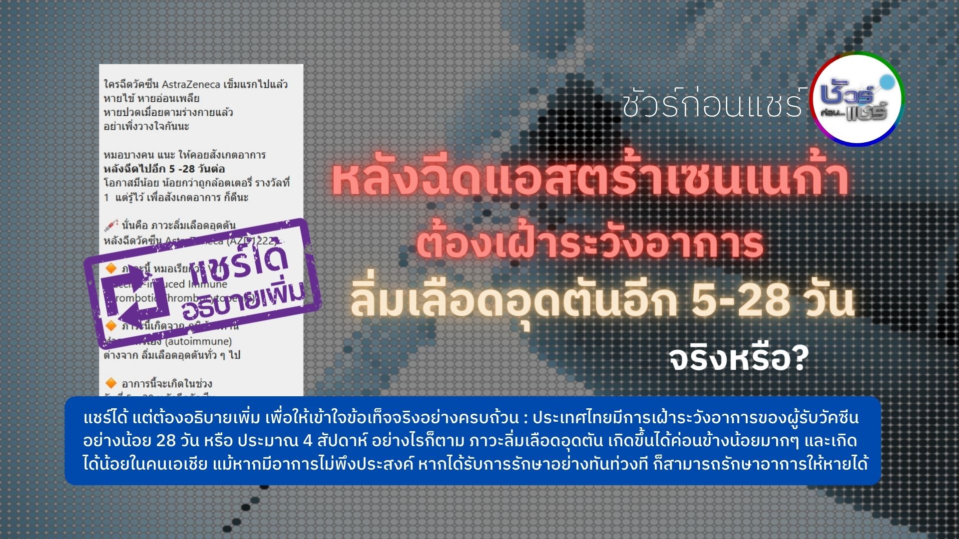 บนสื่อสังคมออนไลน์มีการแชร์ข้อมูล หากหายไข้หลังจากฉีดวัคซีนแอสตร้าเซนเนก้าแล้ว ให้ประชาชนเฝ้าระวังอาการลิ่มเลือดอุดตัน หลังจากฉีดวัคซีนฯ ไปอีก 5-28 วัน ศูนย์ชัวร์ก่อนแชร์ ตรวจสอบข้อมูลดังกล่าวพบว่า เป็นเรื่องจริง