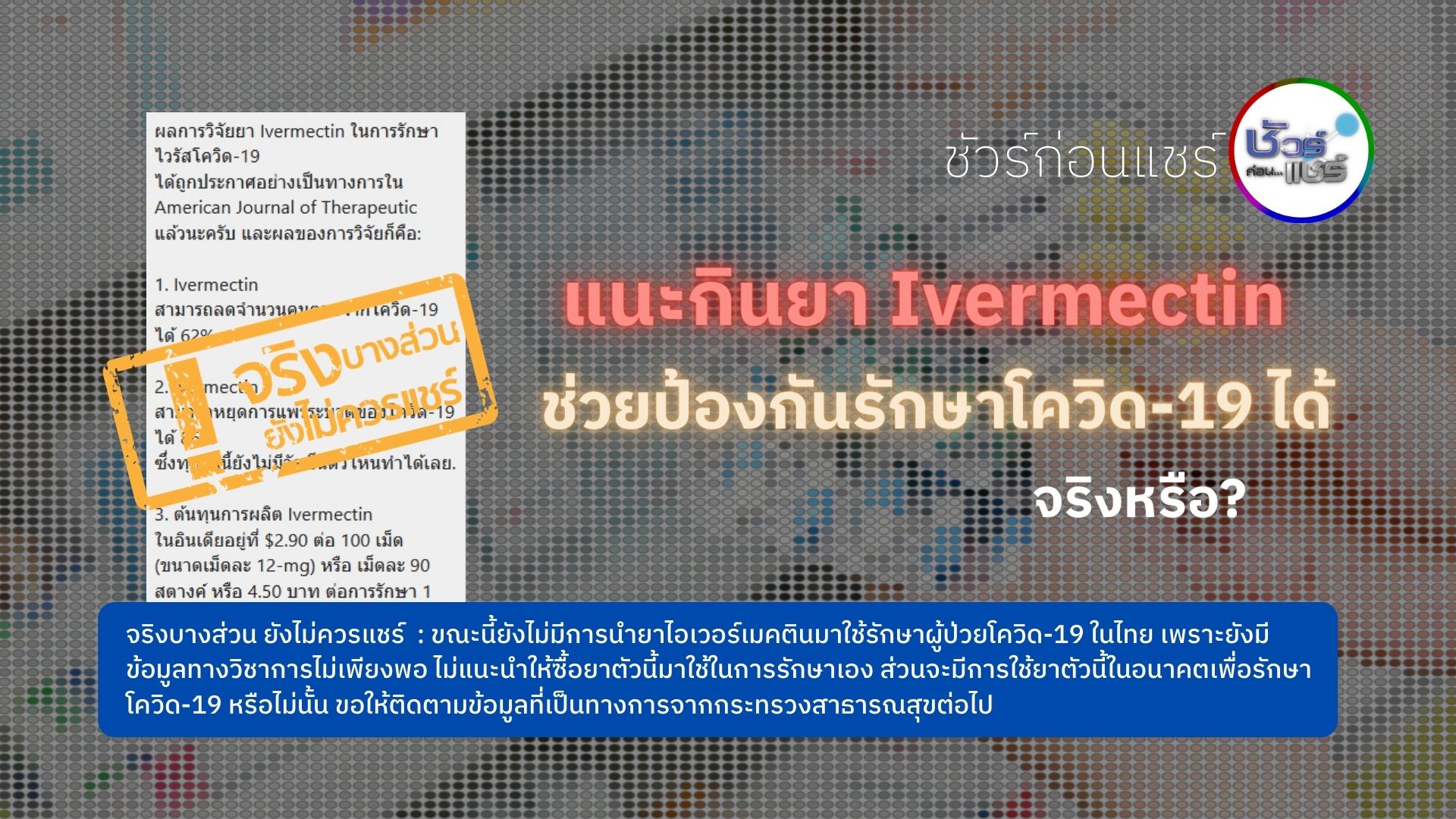 Q : มีการแชร์ข้อมูลบนสื่อออนไลน์ว่า ยา Ivermectin (ไอเวอร์เมคติน) สามารถใช้รักษาโควิด-19 ได้แล้ว จริงหรือไม่?