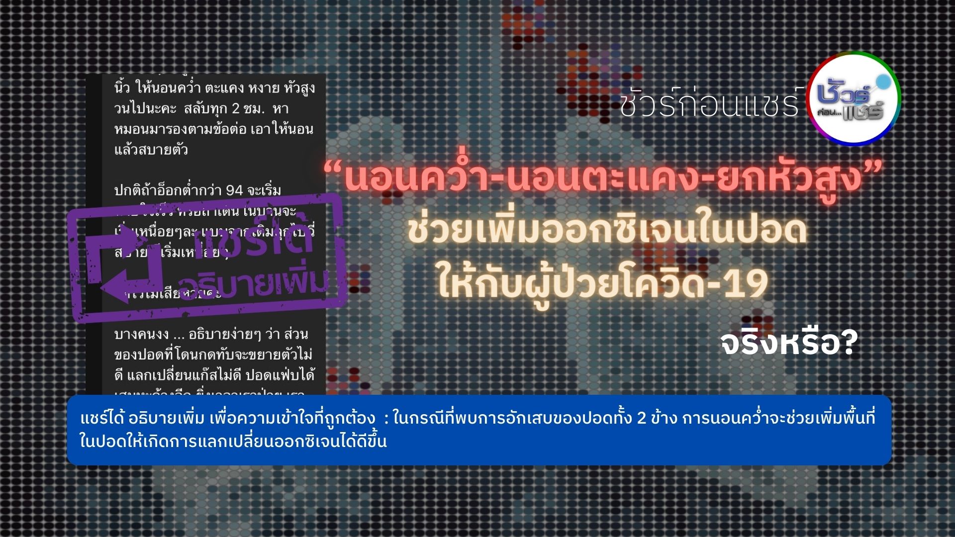 บนสังคมออนไลน์ มีการแชร์คำแนะนำให้ ผู้ป่วยโควิด-19 ที่ยังไม่ได้เตียงในการรักษา ให้นอนคว่ำ นอนตะแคง นอนหงาย สลับกันไปทุก 2 ชั่วโมง เพื่อให้ปอดเกิดการแลกเปลี่ยนออกซิเจนได้ดีขึ้น และช่วยในการขับเสมหะ ศูนย์ชัวร์ก่อนแชร์ตรวจสอบเรื่องดังกล่าวแล้วพบว่า แชร์ได้ อธิบายเพิ่ม ในกรณีที่พบการอักเสบของปอดทั้ง 2 ข้าง การนอนคว่ำจะช่วยเพิ่มพื้นที่ในปอดให้เกิดการแลกเปลี่ยนออกซิเจนได้ดีขึ้น