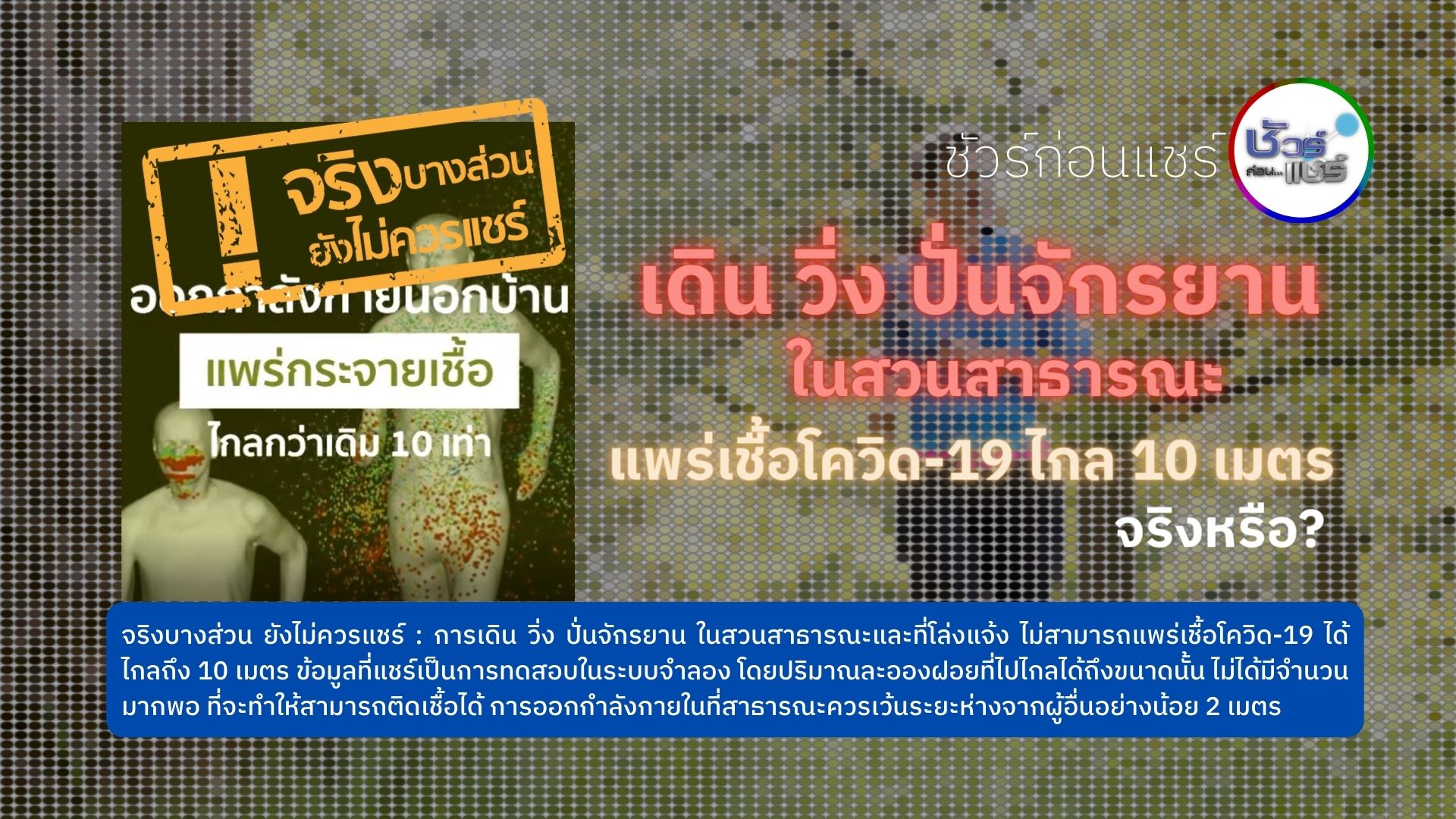 A : เรื่องนี้จริงบางส่วน แต่ยังไม่ควรแชร์ เพราะเป็นการทดสอบในระบบจำลอง และในคลิปวิดีโอไม่ได้ระบุว่าละอองฝอยที่แพร่กระจายไปได้ไกล ยังมีปริมาณไม่มากพอที่จะทำให้ติดเชื้อได้ การแชร์คลิปวีดีโอดังกล่าวจะทำให้เกิดการกลัวการออกกำลังกาย ซึ่งในความจริงแล้วองค์การอนามัยโลก (WHO) และกรมอนามัย ยังแนะนำให้ออกกำลังกาย เพราะเป็นสิ่งสำคัญที่ควรทำ แม้จะอยู่ในช่วงการแพร่ระบาดของเชื้อไวรัสโควิด-19 เพราะการออกกำลังกายจะทำให้ผู้ออกกำลังกายมีสุขภาพดี ห่างไกลจากโรค NCDs และเสริมภูมิต้านทาน ในเรื่องนี้มีความจริงบางส่วน แต่ถ้าไม่จำเป็น ก็ไม่ต้องแชร์ อย่างไรก็ตามเราสามารถปรับตัวและออกกำลังกายภายในบ้านได้ แต่หากเป็นสวนสาธารณะหรือที่โล่งแจ้งภายในหมู่บ้านที่ไม่ได้มีความแออัด ก็สามารถไปใช้บริการได้ ตามมาตรการความปลอดภัยที่ถูกต้อง