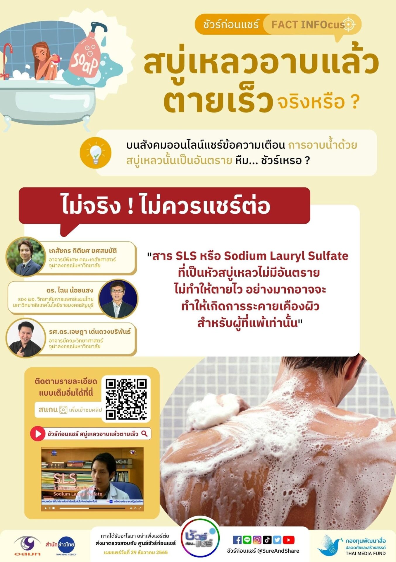 “สบู่เหลวไม่ได้ทำให้ตายเร็วขึ้น สารโซเดียม ลอริล ซัลเฟต (Sodium Lauryl Sulfate) เป็นสารที่ใช้ในผลิตภัณฑ์ทำความสะอาดทั่วไป เช่น น้ำยาล้างจาน แชมพู ยาสีฟัน ซึ่งไม่มีอันตรายต่อสุขภาพแต่อย่างใด