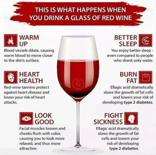 มีการอ้างว่า การดื่มไวน์จะทำให้ผู้ดื่มดูดี เพราะกล้ามเนื้อผิวหน้าจะผ่อนคลายและแก้มจะมีสีแดงอ่อน ๆ