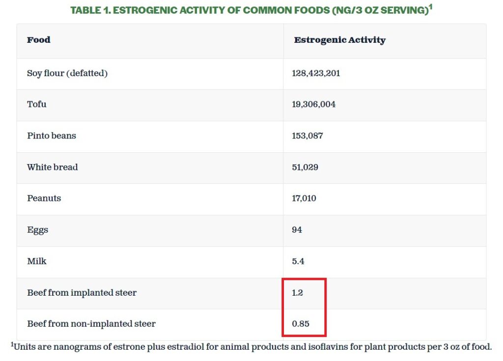 บทความจาก Michigan State University Extension ของมหาวิทยาลัยมิชิแกน สเตท เปรียบเทียบปริมาณฮอร์โมนเอสโตรเจนระหว่างเนื้อวัวที่ได้รับฮอร์โมนเอสโตเจนกับอาหารชนิดต่าง ๆ พบว่า แม้เนื้อวัวที่ได้รับฮอร์โมนเอสโตรเจนจะมีปริมาณฮอร์โมนเอสโตรเจนสูงกว่าเนื้อวัวที่ไม่ใช้ฮอร์โมน แต่ก็ยังมีปริมาณที่น้อยกว่าที่พบในอาหารหลายชนิด ทั้ง ผัก ไข่ และ น้ำนม