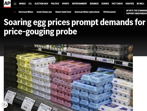 มีทฤษฎีสมคบคิดเกี่ยวกับการขึ้นราคาไข่เผยแพร่ในสหรัฐอเมริกา โดยอ้างสาเหตุที่ไข่ไก่ในสหรัฐฯ มีราคาสูงขึ้น ตามแผนการที่ร่วมมือกันระหว่างอุตสาหกรรมอาหารไก่และอุตสาหกรรมไข่ไก่ ในการปรับเปลี่ยนสูตรอาหารไก่อย่างจงใจเพื่อให้ไก่หยุดออกไข่ ส่งผลกระทบต่อผู้เลี้ยงไก่ในสวนหลังบ้านที่ผลิตไข่ได้น้อยลง และต้องไปซื้อไข่จากผู้ผลิตรายใหญ่ที่โก่งราคาในช่วงที่ไข่ไก่ขาดแคลนระหว่างไข้หวัดนกระบาด