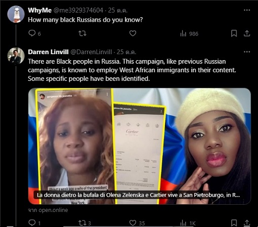 จุดสังเกตคือชายที่อยู่ในคลิปวิดีโอพูดด้วยสำเนียงแอฟริกันตะวันตก ซึ่งสอดคล้องกับแนวทางของกลุ่ม Storm-1516 ที่มักจะเกณฑ์ตัวแสดงที่เป็นผู้อพยพเชื้อสายแอฟริกันในเมืองเซนต์ปีเตอร์สเบิร์ก