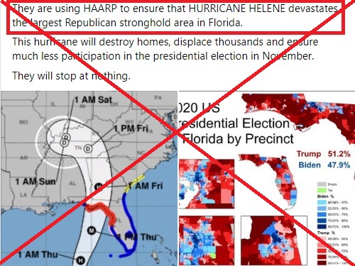 มีข้อมูลเท็จเกี่ยวกับพายุเฮอริเคนในฟลอริดาเผยแพร่ทางสื่อสังคมออนไลน์ในสหรัฐอเมริกา โดยอ้างว่าเบื้องหลังเหตุพายุเฮอริเคนพัดกระหน่ำในรัฐฟลอริดาหลายครั้งติดต่อกัน มีสาเหตุมาจากการทดลองส่งคลื่นวิทยุไปยังชั้นบรรยากาศโลก อันเป็นผลงานของโครงการ HAARP พร้อมหลักฐานคลิปวิดีโอที่อ้างว่ามีการซ่อนอุปกรณ์ของ HAARP บริเวณใต้ทะเลชายฝั่งของรัฐฟลอริดาอีกด้วย