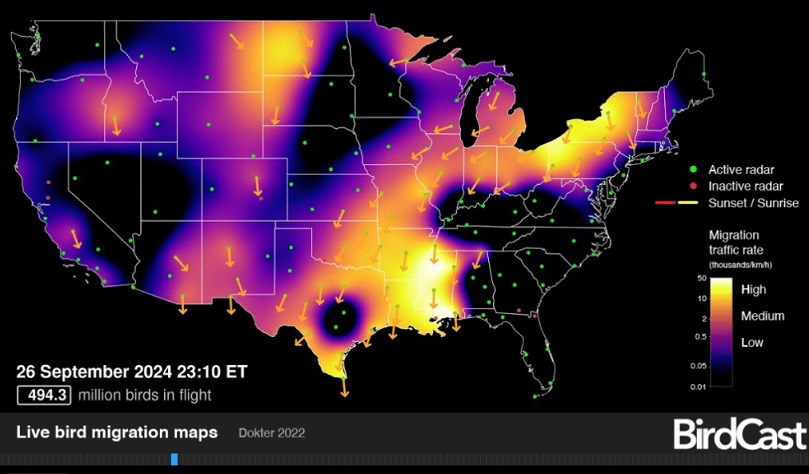 ข้อมูลจาก BirdCast ที่ตรวจสอบการอพยพของนกในคืนที่พายุเฮอริเคนเฮลีนพัดขึ้นฝั่งในรัฐฟลอริดาเมื่อวันที่ 26 กันยายน 2024 แสดงข้อมูลการบินของนกเกือบ 500 ล้านตัว ซึ่งทิศทางการบินของนกที่อพยพจากพายุเฮอริเคนเฮลีนสอดคล้องกับข้อมูลที่พบในแผนที่ NEXRAD