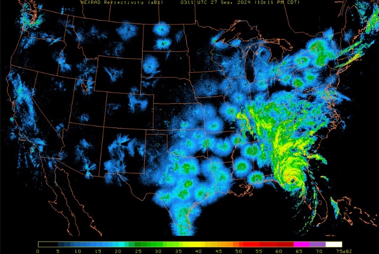 แต่แท้จริงแล้ว จุดสีฟ้าบนแผนที่ NEXRAD แสดงการอพยพของนกหลังพายุเฮอริเคนเฮลีนพัดขึ้นฝั่งในรัฐฟลอริดาเมื่อวันที่ 27 กันยายน 2024 นั่นเอง