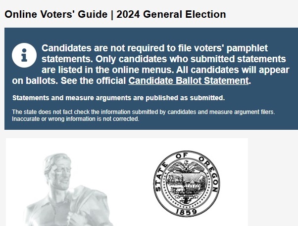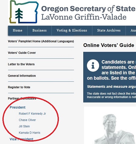 โฆษกของรัฐมนตรีกิจการแห่งรัฐโอเรกอนชี้แจงว่า ผู้สมัครที่จะมีชื่ออยู่บนเมนูของเพจคู่มือผู้ใช้สิทธิเลือกตั้งในรัฐโอเรกอน คือผู้สมัครที่ส่งข้อมูลเกี่ยวกับผู้สมัครมาเผยแพร่กับทางเว็บไซต์เท่านั้น