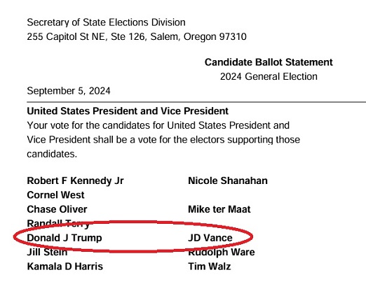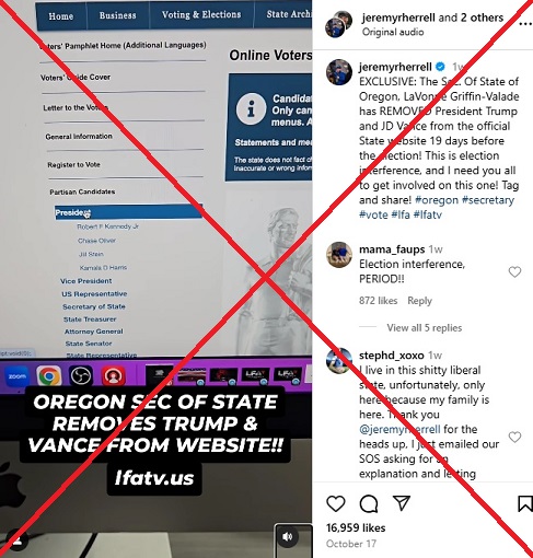 มีข้อมูลเท็จเกี่ยวกับการเลือกตั้งประธานาธิบดีสหรัฐอเมริกา เผยแพร่ทางสื่อสังคมออนไลน์ในต่างประเทศ เมื่ออ้างว่ามีความพยายามแทรกแซงการเลือกตั้งประธานาธิบดีในรัฐโอเรกอน เมื่อชื่อของอดีตประธานาธิบดี โดนัลด์ ทรัมป์ และ เจดี แวนซ์ ของพรรครีพับลิกัน ถูกลบออกจากหน้าเพจคู่มือผู้ใช้สิทธิเลือกตั้ง ในเว็บไซต์ของรัฐมนตรีกิจการแห่งรัฐโอเรกอน
