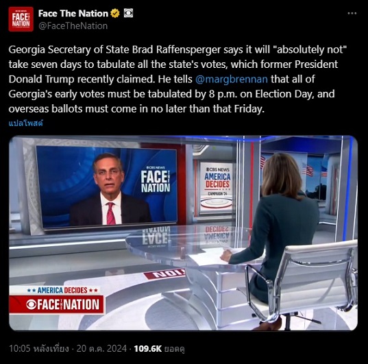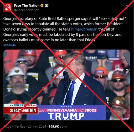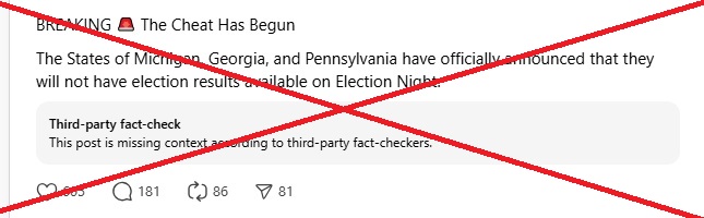 มีข้อมูลเท็จเกี่ยวกับการเลือกตั้งประธานาธิบดีสหรัฐอเมริกา เผยแพร่ทางสื่อสังคมออนไลน์ในต่างประเทศ เมื่อมีความพยายามอ้างว่า 3 รัฐสมรภูมิหรือ Swing State ได้แก่ จอร์เจีย มิชิแกน และ เพนซิลเวเนีย ส่อจะมีการบิดเบือนผลการนับคะแนนเลือกตั้ง เนื่องจากทั้ง 3 รัฐเปิดเผยว่าผลการเลือกตั้งของรัฐอาจจะประกาศไม่ทันคืนวันที่ 5 พฤศจิกายน ซึ่งตรงกับวันเลือกตั้งนั่นเอง