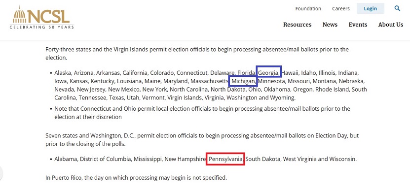 ข้อมูลจากหน่ายงาน National Conference of State Legislatures (NSCL) ระบุว่า มี 43 รัฐและหมู่เกาะเวอร์จินของสหรัฐ ที่อนุญาตการนับบัตรเลือกตั้งล่วงหน้าก่อนวันเลือกตั้ง ซึ่งรวมถึงรัฐจอร์เจียและมิชิแกน