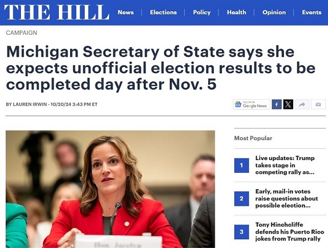 โจเซลิน เบนสัน รัฐมนตรีกิจการแห่งรัฐมิชิแกน ชี้แจงเมื่อวันที่ 20 ตุลาคมว่า ผลการเลือกตั้งอย่างไม่เป็นทางการของรัฐมิชิแกน จะรู้ผลหลังวันที่ 5 พฤศจิกายน