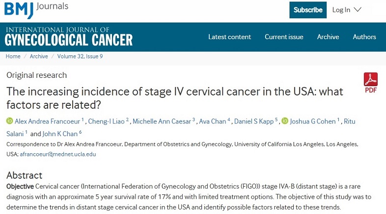เฟรนเคอร์และคณะวิจัยสำรวจจำนวนผู้ป่วยมะเร็งปากมดลูกระยะสุดท้าย ซึ่งเป็นระยะที่มะเร็งลุกลามไปยังกระเพาะปัสสาวะและลำไส้ใหญ่ส่วนปลาย โดยพบว่าในช่วงปี 2001-2018 จำนวนผู้ป่วยมะเร็งปากมดลูกระยะที่ 4 เพิ่มขึ้น 1-3% ต่อปี