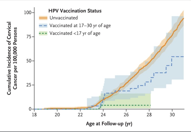 ทีมวิจัยพบว่า กลุ่มสตรีที่ได้รับวัคซีน HPV มีความเสี่ยงป่วยด้วยโรคมะเร็งปากมดลูกน้อยกว่ากลุ่มที่ไม่ได้ฉีดวัคซีนอย่างมาก โดยพบว่ากลุ่มที่ได้รับวัคซีน HPV ระหว่างอายุ 17-30 ปี ลดความเสี่ยงมะเร็งปากมดลูกได้ 53% ส่วนผู้ที่ได้รับวัคซีน HPV ก่อนอายุ 17 ปี ลดความเสี่ยงมะเร็งปากมดลูกได้ 90%