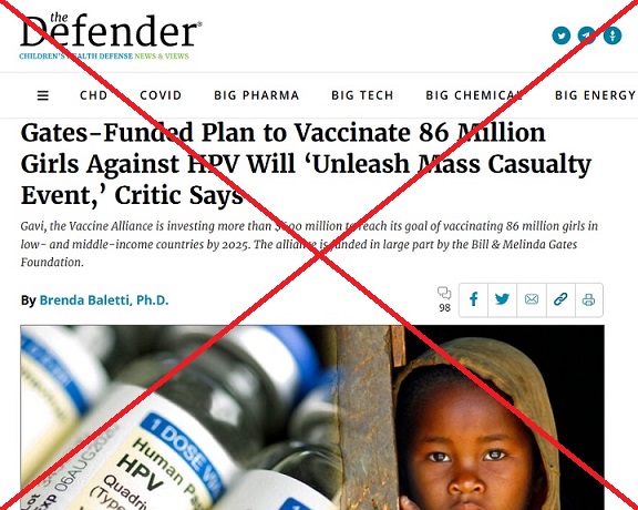 มีข้อมูลเท็จเกี่ยวกับวัคซีน HPV เผยแพร่ทางเว็บไซต์ในสหรัฐอเมริกา โดยองค์กร Children’s Health Defense เผยแพร่รายงานโจมตีแผนรณรงค์ฉีดวัคซีน HPV ในหลายประเทศทั่วโลกว่า จะนำไปสู่ความสูญเสียครั้งใหญ่ สาเหตุเป็นเพราะวัคซีน HPV นำไปสู่อาการข้างเคียงเกี่ยวกับโรคภูมิคุ้มกันทำลายตนเองและโรคระบบประสาทหลายชนิดทั้ง อาการล้าเรื้อรัง อาการปวดทั่วร่างกายเรื้อรัง การเกิดอาการหัวใจเต้นเร็วระหว่างเปลี่ยนท่า และ อาการปวดกล้ามเนื้อเหตุสมองและไขสันหลังอักเสบ
