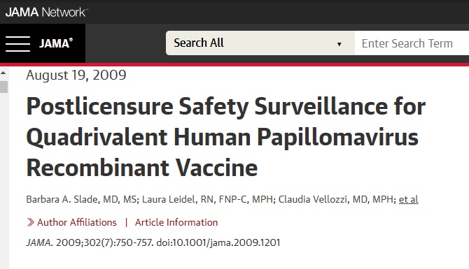 ข้อมูลอาการข้างเคียงรุนแรงจากวัคซีน HPV ที่ Children’s Health Defense กล่าวอ้าง นำมาจากงานวิจัยปี 2009 ตีพิมพ์ในวารสาร JAMA ในหัวข้อ Postlicensure Safety Surveillance for Quadrivalent Human Papillomavirus Recombinant Vaccine ซึ่งเป็นการสำรวจอาการไม่พึงประสงค์จากวัคซีน HPV สูตร 4 สายพันธุ์ระหว่างปี 2006-2009