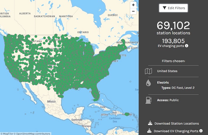 ข้อมูลจากศูนย์ข้อมูลพลังงานทางเลือก โดยสำนักงาน Joint Office of Energy and Transportation ของสหรัฐฯ พบว่า ในเดือนพฤศจิกายน 2024 ในสหรัฐฯ มีสถานีชาร์จรถยนต์ไฟฟ้าสาธารณะแบบ AC และ DC ที่ใช้งานได้ทั่วประเทศประมาณ 69,000 สถานี และมีหัวจ่ายไฟฟ้าจำนวน 193,000 หัวจ่าย