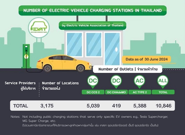 ส่วนข้อมูลในประเทศไทยถึงเดือนมิถุนายน 2024 โดยสมาคมยานยนต์ไฟฟ้าไทยพบว่า ประเทศไทยมีสถานีชาร์จรถยนต์ไฟฟ้าสาธารณะทั้งสิ้น 3,175 สถานี และมีหัวจ่ายไฟฟ้าจำนวน 10,846 หัวจ่าย